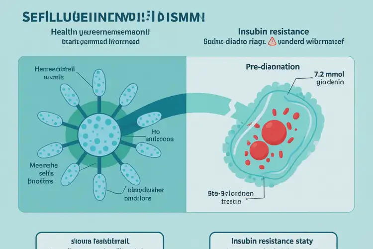 糖尿病前期界定:當睡前血糖持續(xù)處于6.1–7.0 mmol/L區(qū)間,即被定義為糖尿病前期。7.2 mmol/L已超出該上限,雖未達糖尿病診斷閾值(≥7.0 mmol/L空腹或隨機),但已進入高風險預警區(qū),提示胰島素抵抗初現(xiàn),葡萄糖在血液中開始異常堆積。