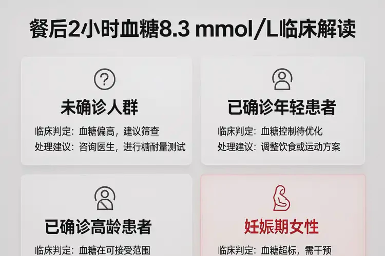 | 妊娠期女性 | 餐后2小時(shí)要求<8.5 | 8.3正常 | 規(guī)范產(chǎn)檢與血糖監(jiān)測(cè),遵醫(yī)囑管理 |
